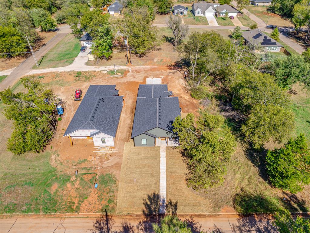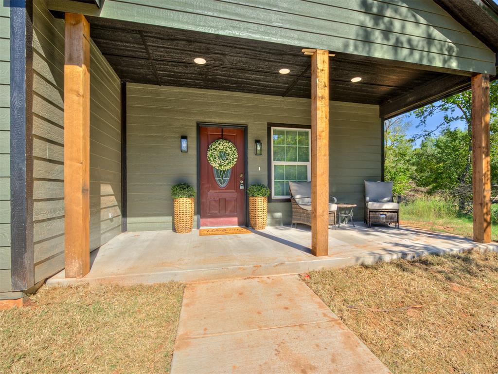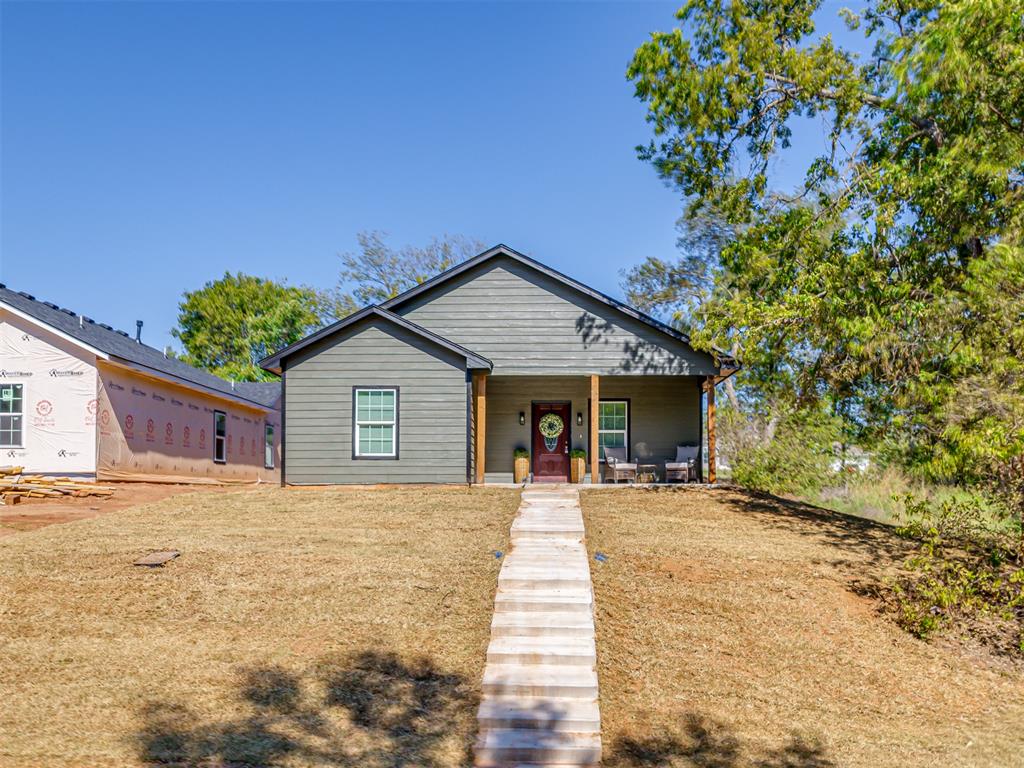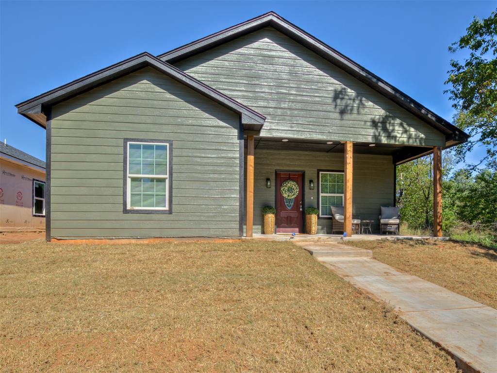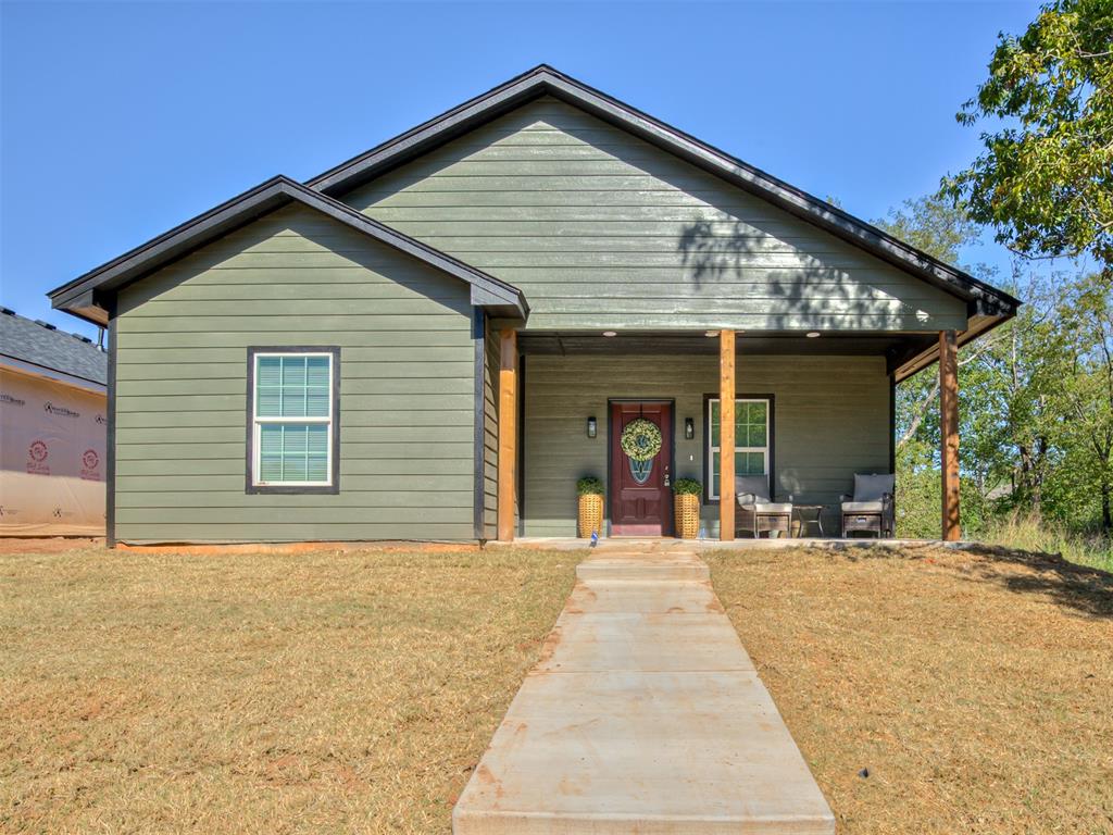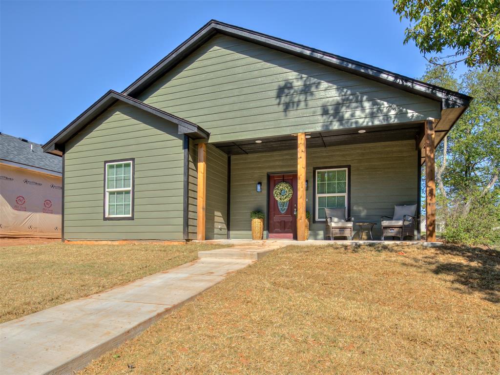 Welcome home to this beautifully built new construction in historic Guthrie -- just minutes from downtown festivals, shops, and small-town charm! One of two new homes built side by side, this darling property blends the warmth of a classic Guthrie cottage with the ease of modern living. Enjoy your mornings on the oversized front porch with a cup of coffee, or unwind in the evenings as the sun sets. Step inside to a bright, open living space filled with natural light, cathedral ceilings, warm wood-look tile floors, and a cozy gas fireplace -- perfect for gathering or relaxing. The open-concept layout flows into a spacious dining area and stunning kitchen with quartz countertops, crisp white cabinetry, subway tile backsplash, and brand-new stainless steel appliances. Off the garage, a convenient laundry and mudroom combo includes space for your pets too. The private primary suite is tucked at the back of the home with a beautifully tiled shower, walk-in closet, and charming wood beam ceiling accent. Two additional bedrooms and a full bath at the front complete the thoughtful split floor plan -- giving everyone their own space.