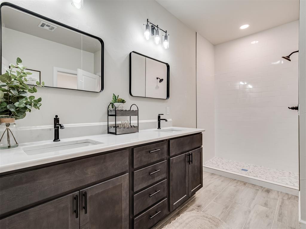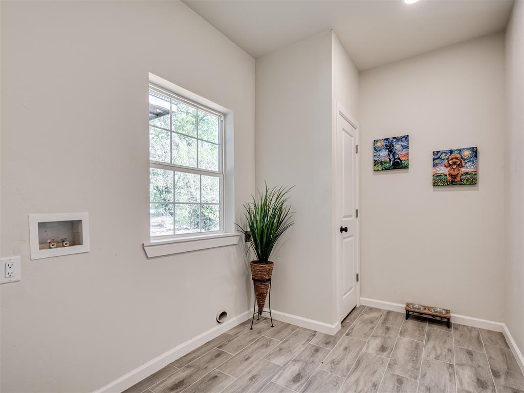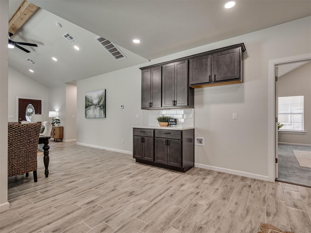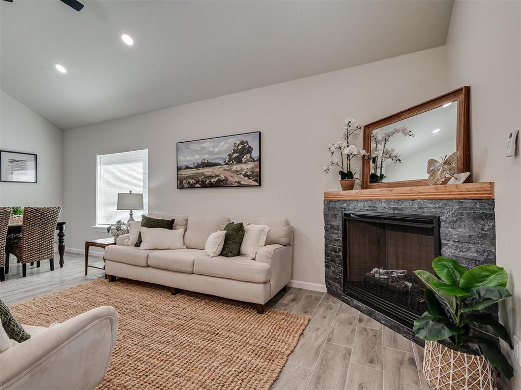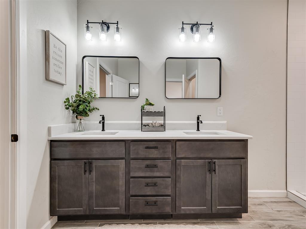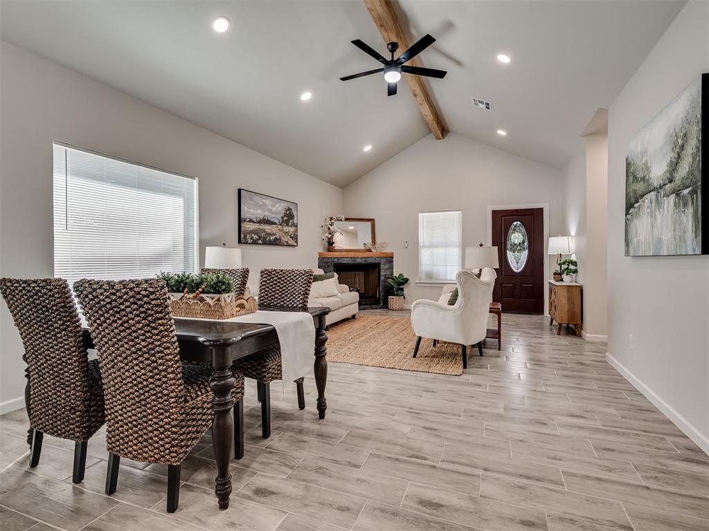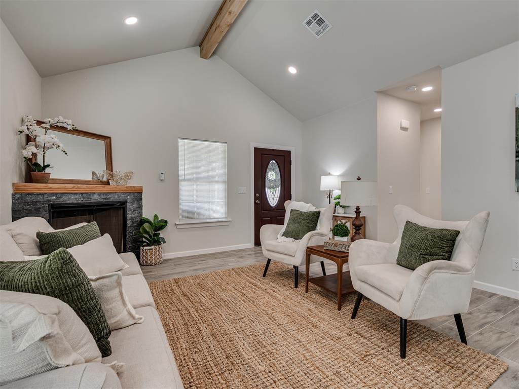 Welcome home to this beautifully built new construction in historic Guthrie -- just minutes from downtown festivals, shops, and small-town charm! One of two new homes built side by side, this darling property blends the warmth of a classic Guthrie cottage with the ease of modern living. Enjoy your mornings on the oversized front porch with a cup of coffee, or unwind in the evenings as the sun sets. Step inside to a bright, open living space filled with natural light, cathedral ceilings, warm wood-look tile floors, and a cozy gas fireplace -- perfect for gathering or relaxing. The open-concept layout flows into a spacious dining area and stunning kitchen with quartz countertops, crisp white cabinetry, subway tile backsplash, and brand-new stainless steel appliances. Off the garage, a convenient laundry and mudroom combo includes space for your pets too. The private primary suite is tucked at the back of the home with a beautifully tiled shower, walk-in closet, and charming wood beam ceiling accent. Two additional bedrooms and a full bath at the front complete the thoughtful split floor plan -- giving everyone their own space.